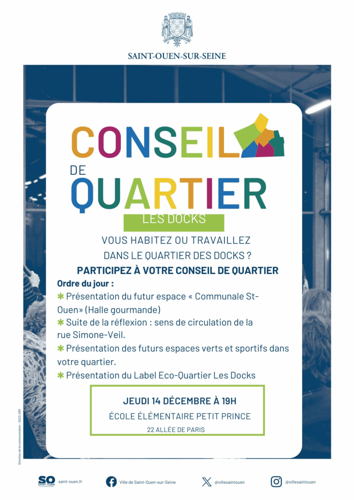 Conseil de quartier des Docks Vous habitez ou travaillez dans le quartier des Docks? Participez à votre conseil de quartier ! Jeudi 14 décembre 2023 à 19h Ecole Le Petit Prince – 22 allée de Paris